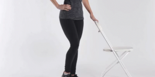 身體站直,兩腳距離約與肩同寬。右手扶著椅背,左腳打直往外側抬起,做外展的動作。感受髖部附近的肌肉收緊。
