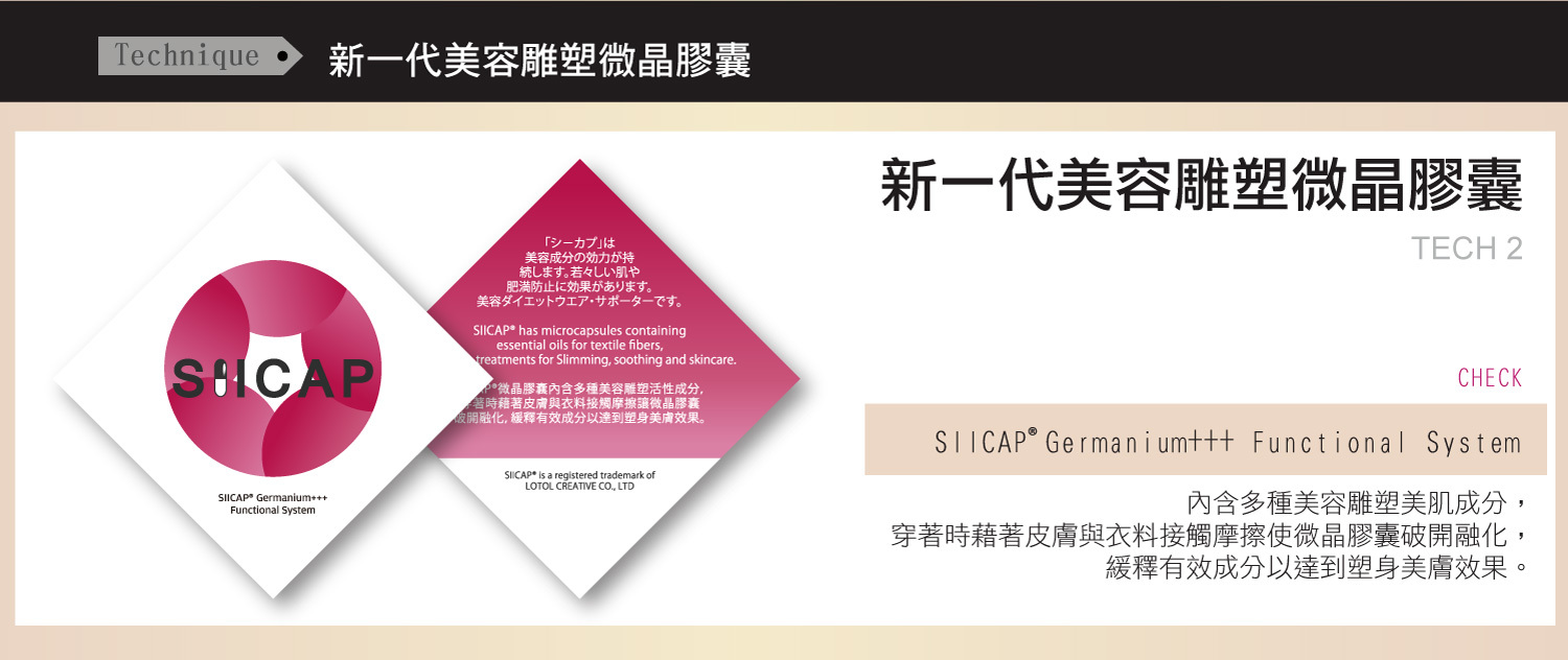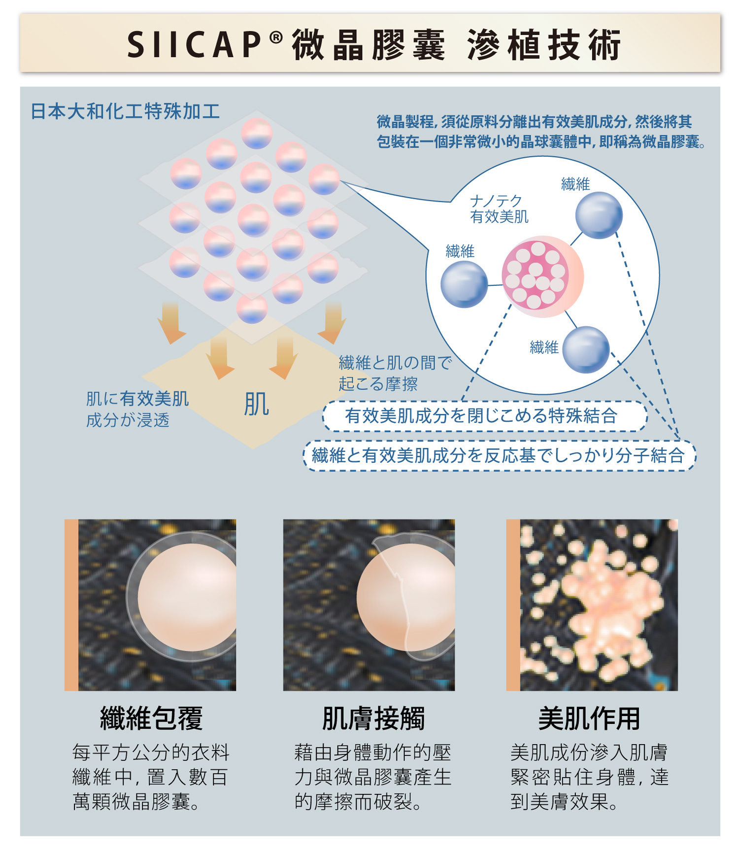SIICAP®微晶膠囊包覆技術,把美膚保養成份附著於纖維,藉由膚溫釋放煥白潤膚因子,機能補正體態的同時,擁有細緻光滑美護膚。