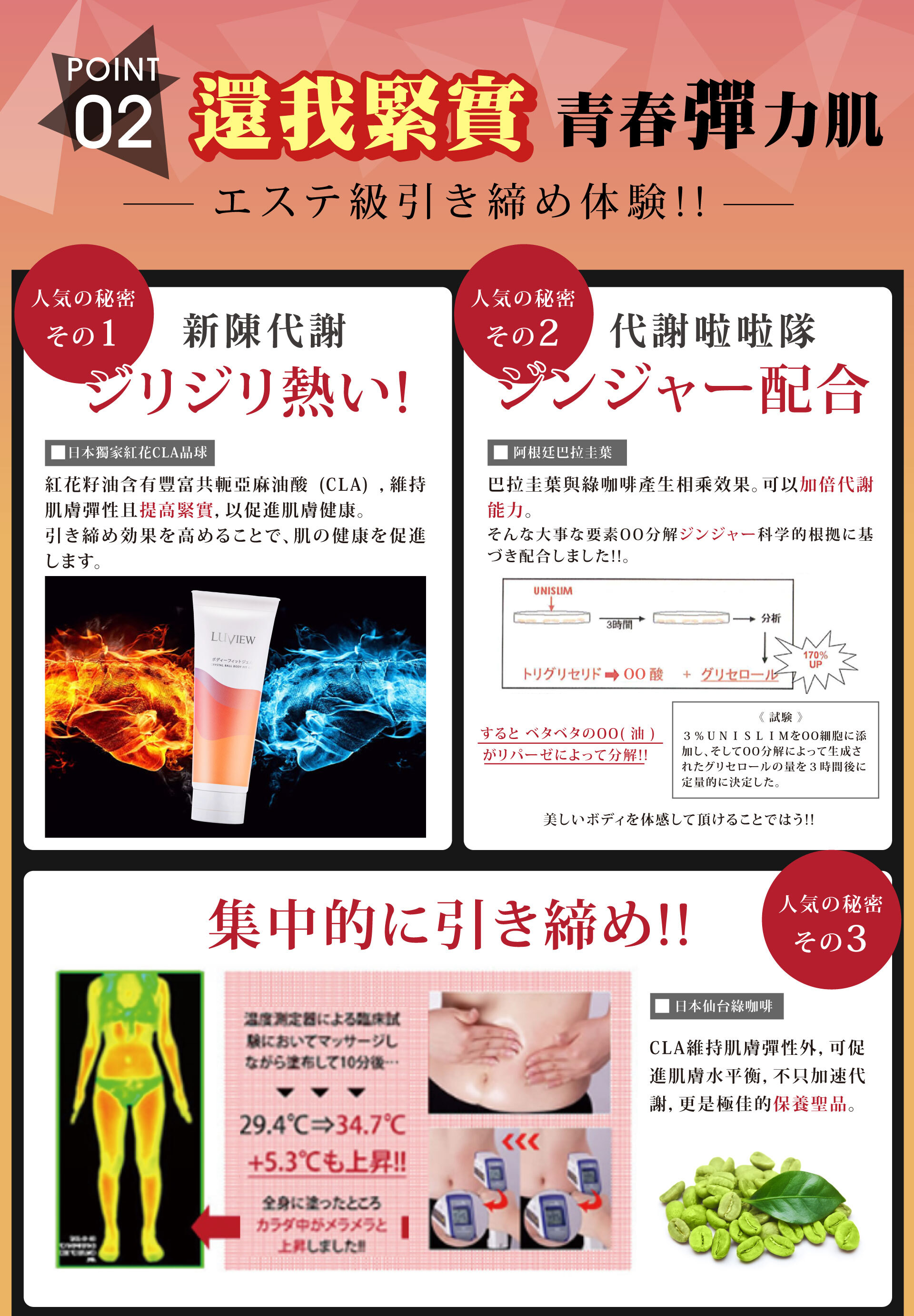 | 產品特色 | Luview採用頂級保鮮科技-晶凍技術,在最短時間內,提高有效成分真實含量,再透過按摩利用人體的溫度將紅花液晶完全滲透至肌膚,讓肌膚高效吸收的有效成分。CLA紅花為主要成分,日本獨創紅花液晶低溫萃取技術,利用低溫冷卻萃取技術,將紅花成分幾乎完全提取出最精華的部分,在零下40度C下將所有成份維持最佳狀態,低溫萃取技術為的是提供無害、高成效、高品質的產品。日本唯一機能新凍劑型,特殊水凝膠體,可使美體因子均勻分散,使人體更好吸收。冰涼QQ的質地清爽不黏膩,皮膚表層無殘留膏體,帶來最舒適的使用感。 |