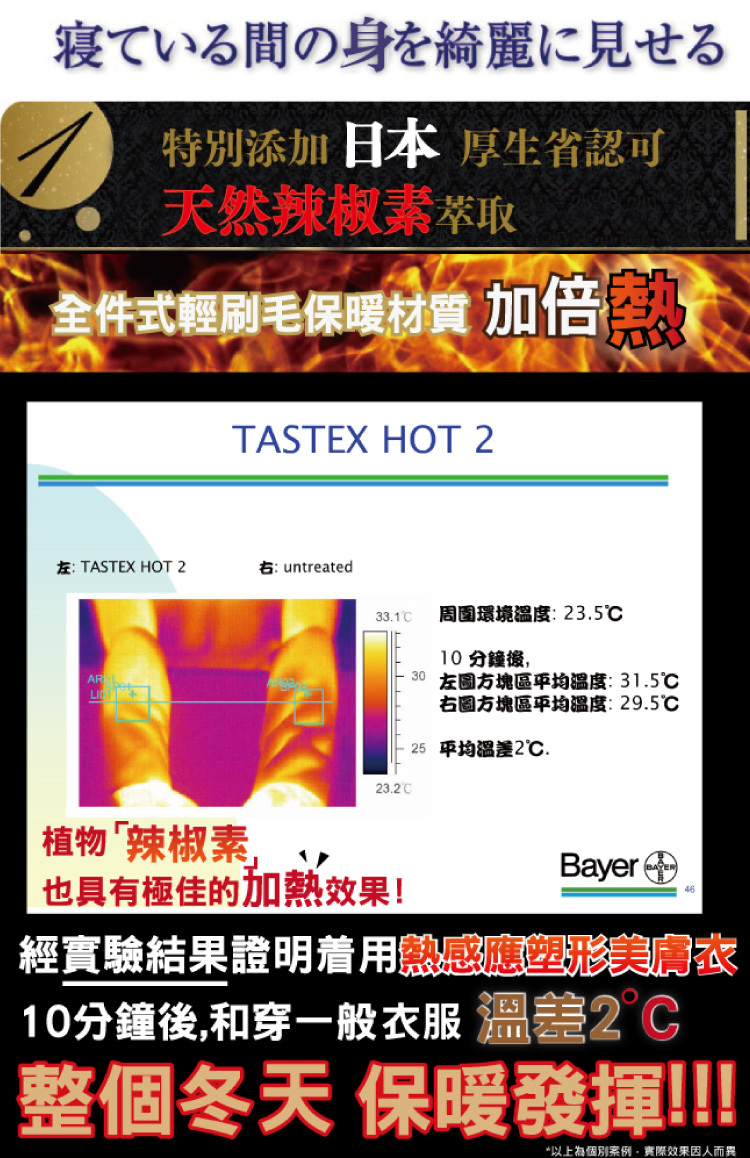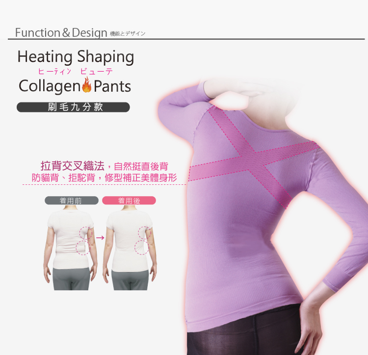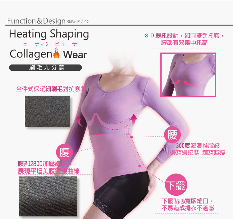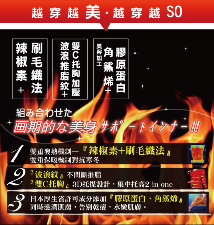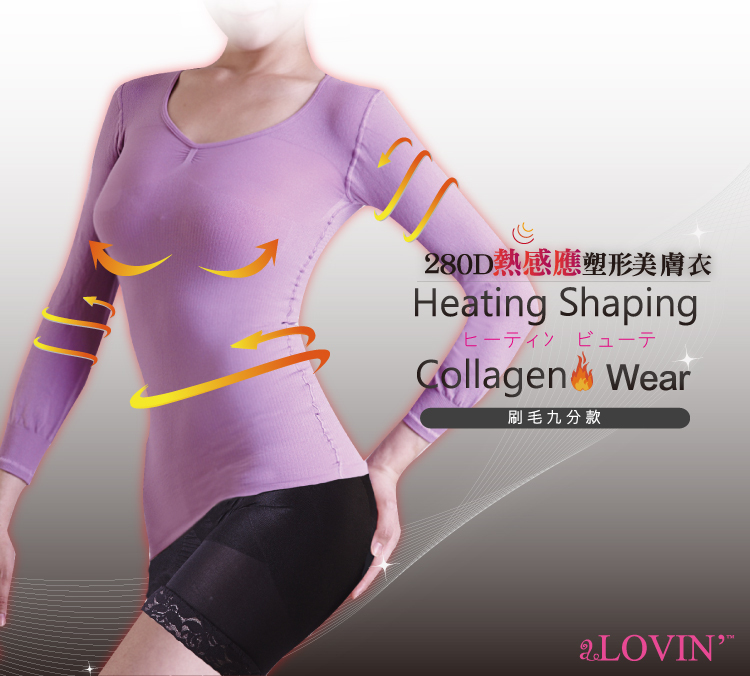 | 產品特色 | 越穿越美 越穿越瘦 熱感應塑形美膚衣!內刷毛保暖,額外添加辣椒素以及膠原蛋白除了保暖外還增添了潤滑肌膚之功效。 |