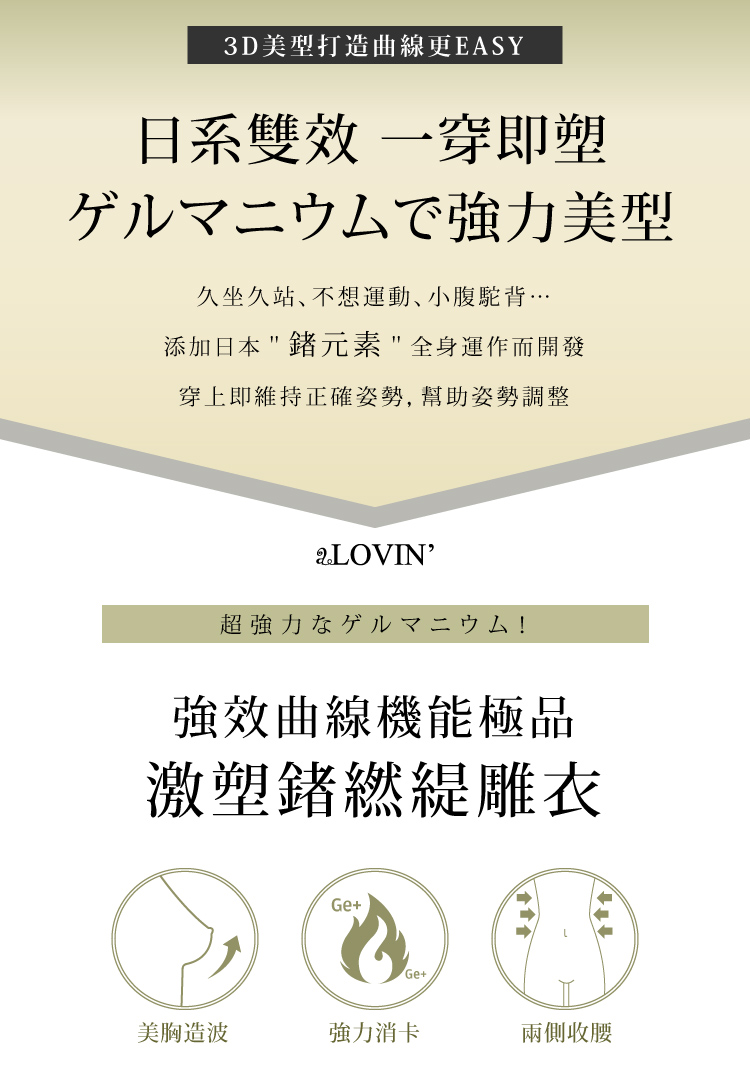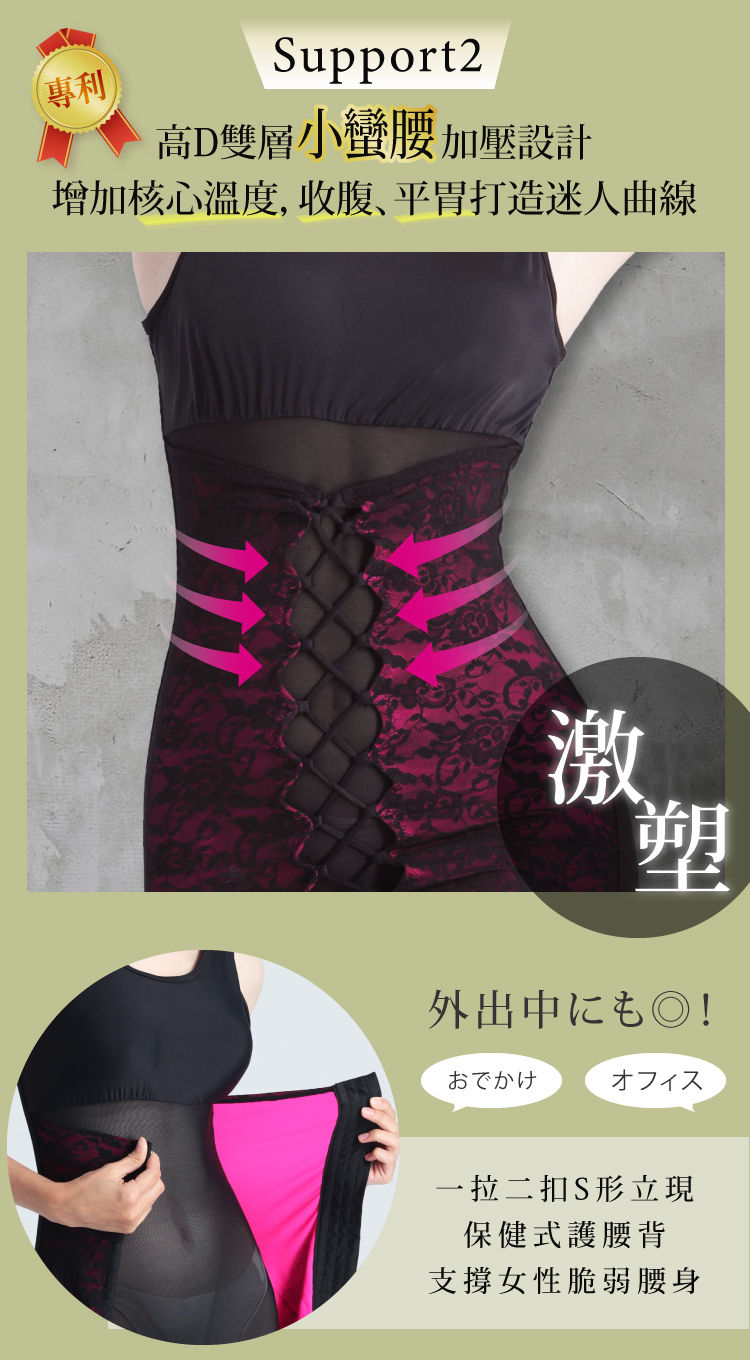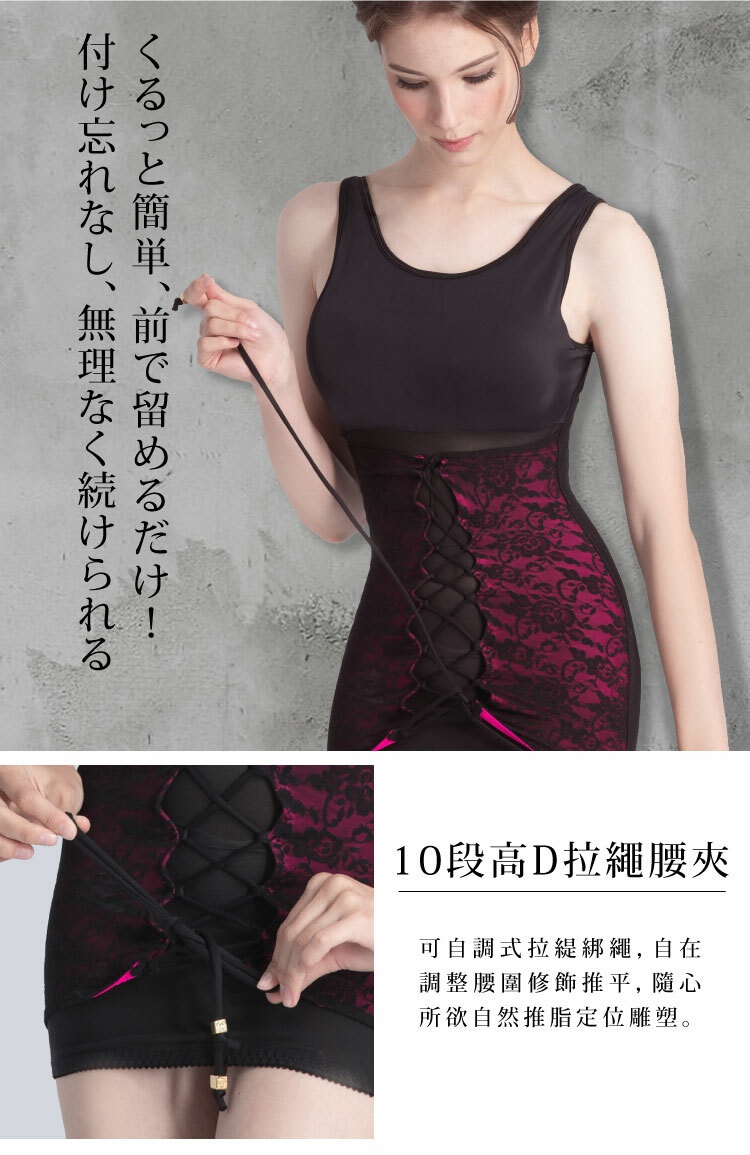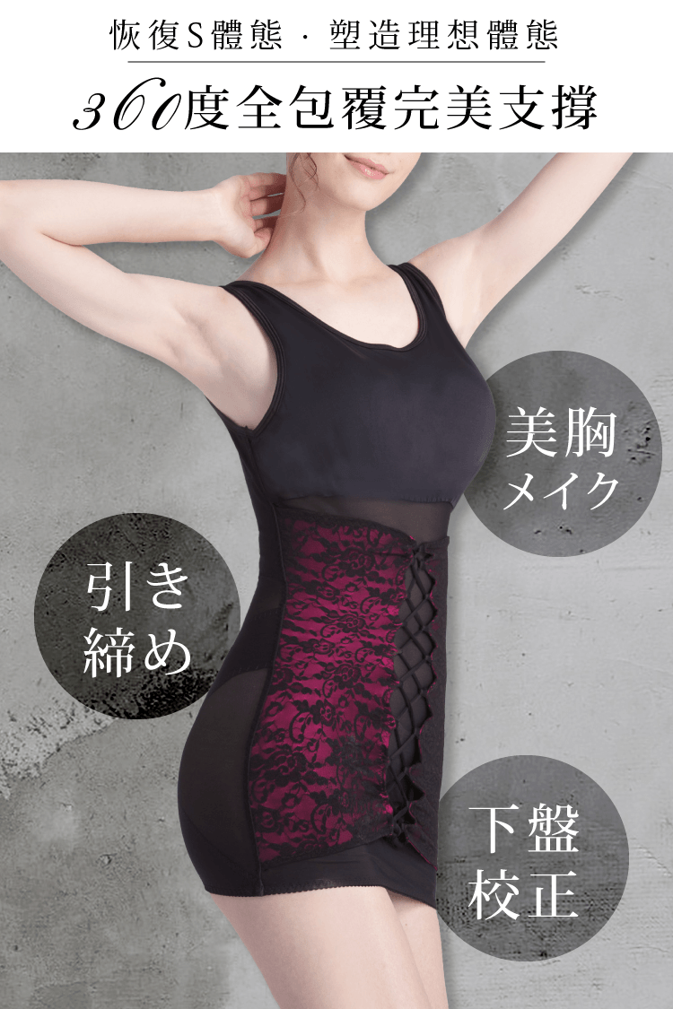 | 產品特色 | 專業級六角網紗,穿著透氣、有效塑型、完整包覆,再加上歐式宮廷蕾絲設計,呈現女人華麗性感。美背補整、兩側收腰、緞面美胸造波一件搞定!老師傅72道手工車縫技術,可調式雙層設計,階段式塑身概念,要為您的動人曲線把關。X型高D推脂提臀帶設計減低翻捲機率,獨家專利,日本鍺能量添加。打造曲線更EASY |