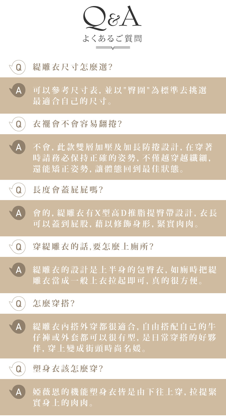 | 產品規格 | 品牌:婭薇恩 aLOVIN 品名:雙效激塑鍺繎緹雕衣 款式:綁繩 成分:尼龍78% 彈性纖維22% (蕾絲:尼龍87% 彈性纖維13%) 尺寸: · M 全長 67cm 腰圍62-72cm 胸圍79-87cm 臀圍82-92cm · L 全長 68cm 腰圍72-82cm 胸圍87-95cm 臀圍92-102cm · XL 全長 70cm 腰圍82-92cm 胸圍95-103cm 臀圍102-112cm ※ 建議挑選尺寸以腰部為主。 ※ 因以手工平放測量尺寸,可能產生誤差值±1-3cm,皆屬合理範圍。 |