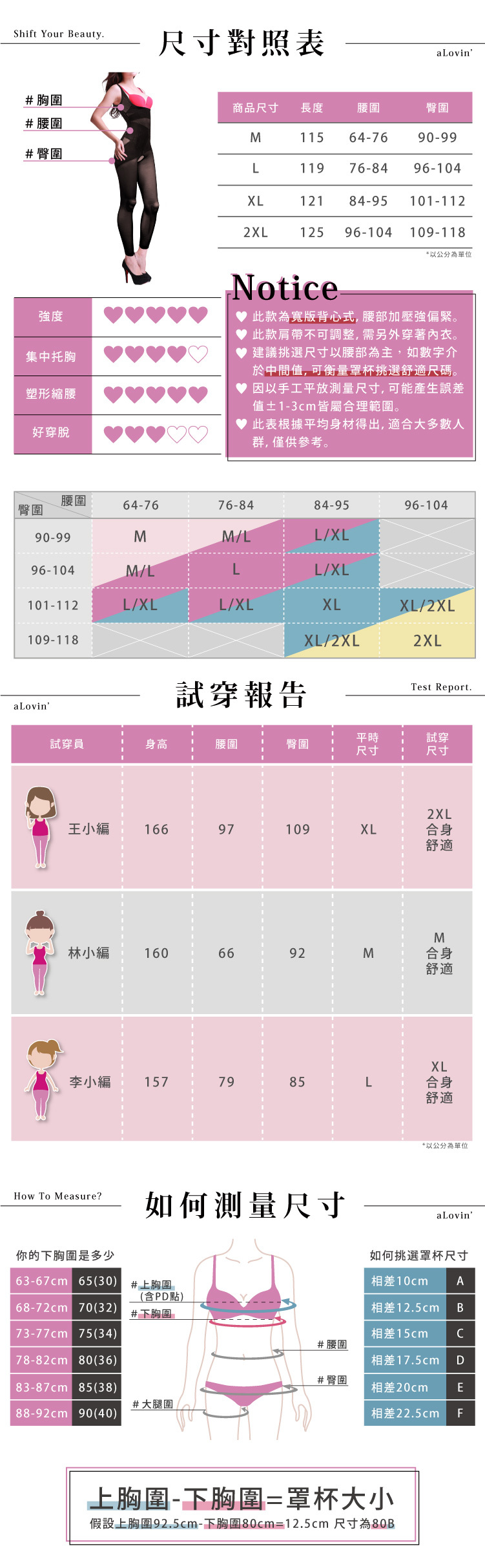 | 產品規格 | 品牌:婭薇恩 aLOVIN 品名:全修身托胸超S連塑衣 顏色:名媛黑 成分:Nylon 78%、Spandex 22% 尺寸: · M:長度115cm 腰圍64-76cm 臀圍90-99cm · L:長度119cm 腰圍76-84cm 臀圍96-104cm · XL:長度121cm 腰圍84-95cm 臀圍101-112cm · XXL:長度125cm 腰圍96-104cm 臀圍109-118cm ※ 因以手工平放測量尺寸,可能產生誤差值±1-3cm,皆屬合理範圍。 |