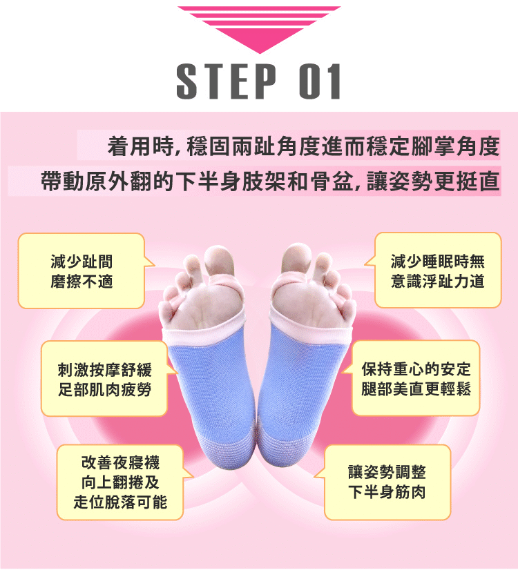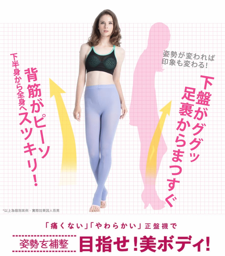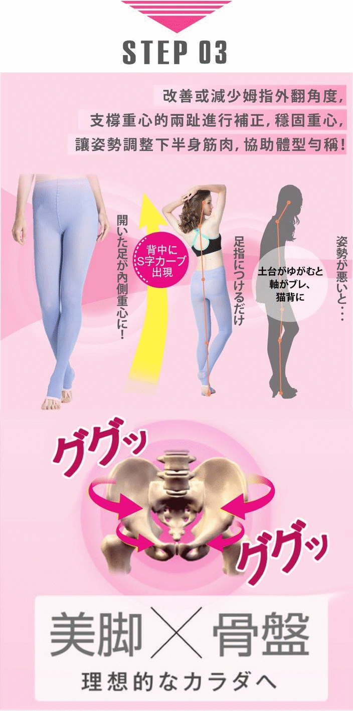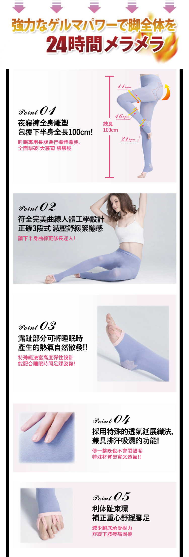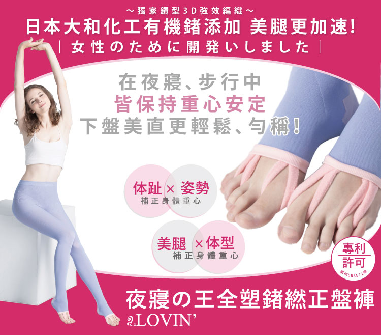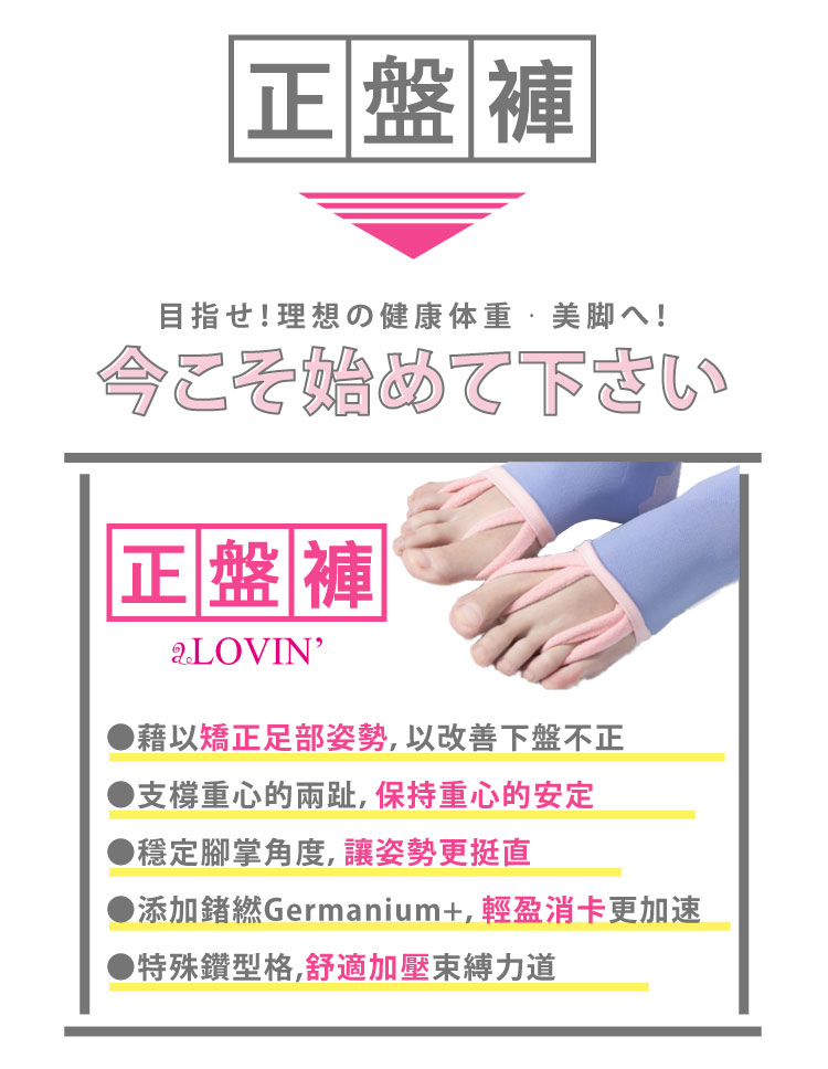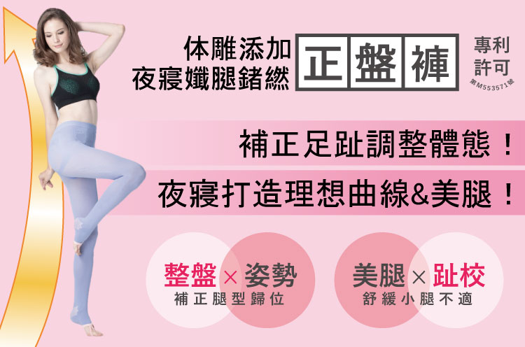 | 產品特色 | 獨家專利立體趾束環能補正重心、紓緩腳足,加速腳尖循環,利用夜寢時間修整姿態,加塑美腿、修臀、抗脹,人體工學設計,能正確分段加壓補正體型, 採用精選彈性紗,舒適親膚透氣無感, 行銷國際,口碑熱銷品。 |