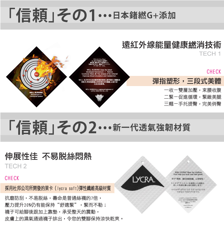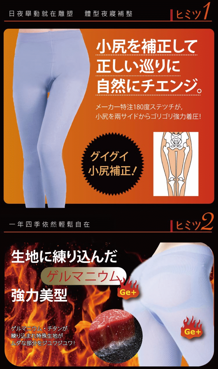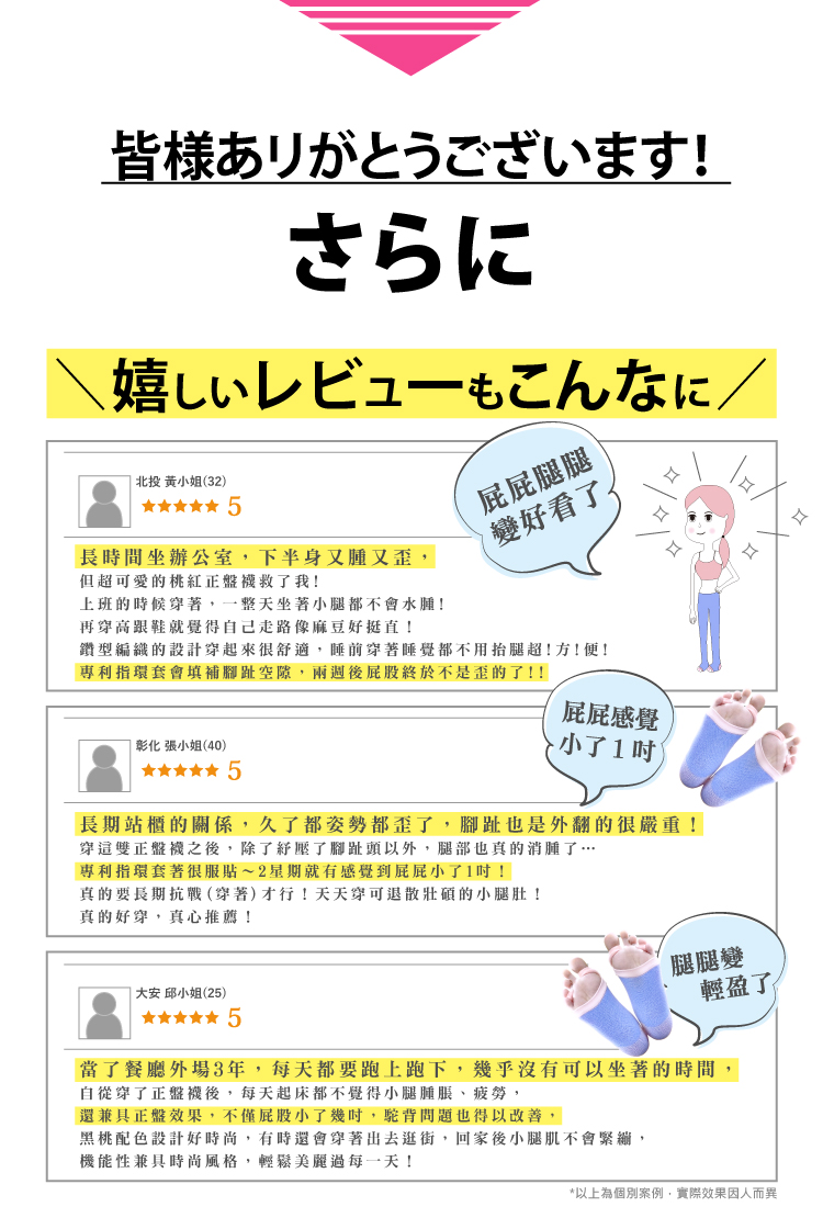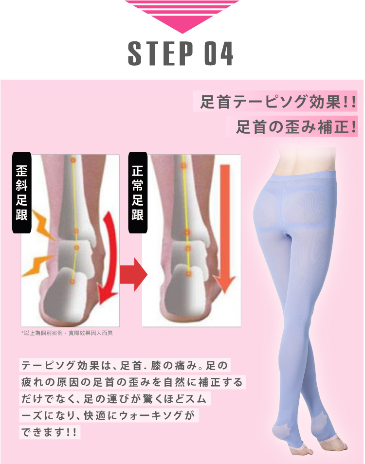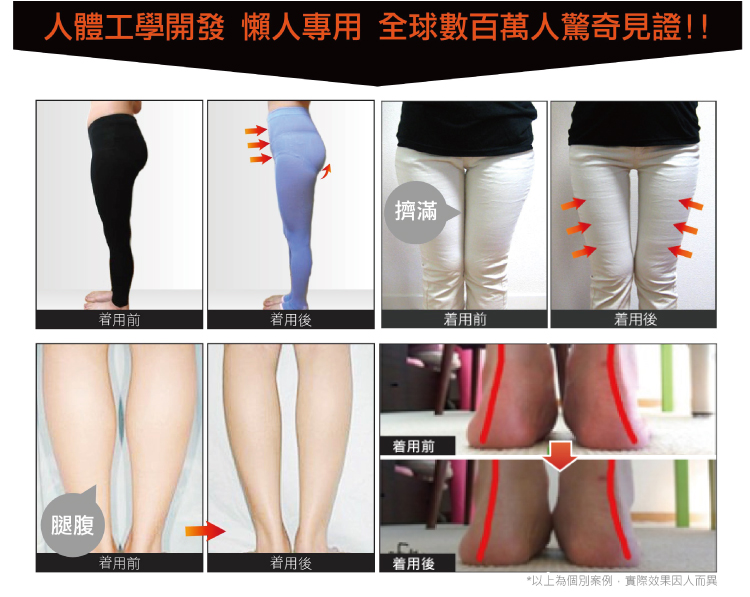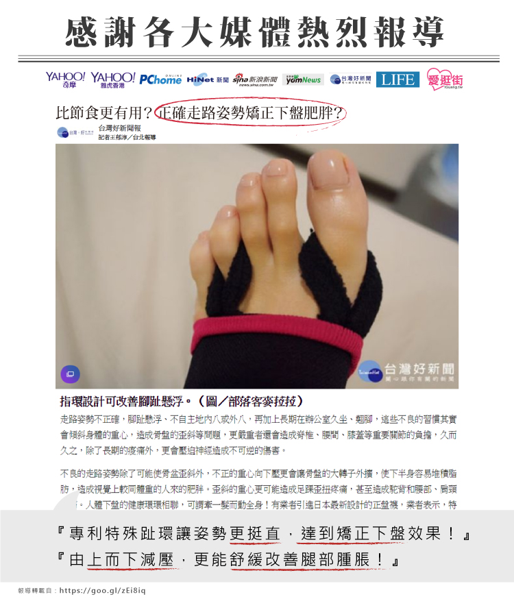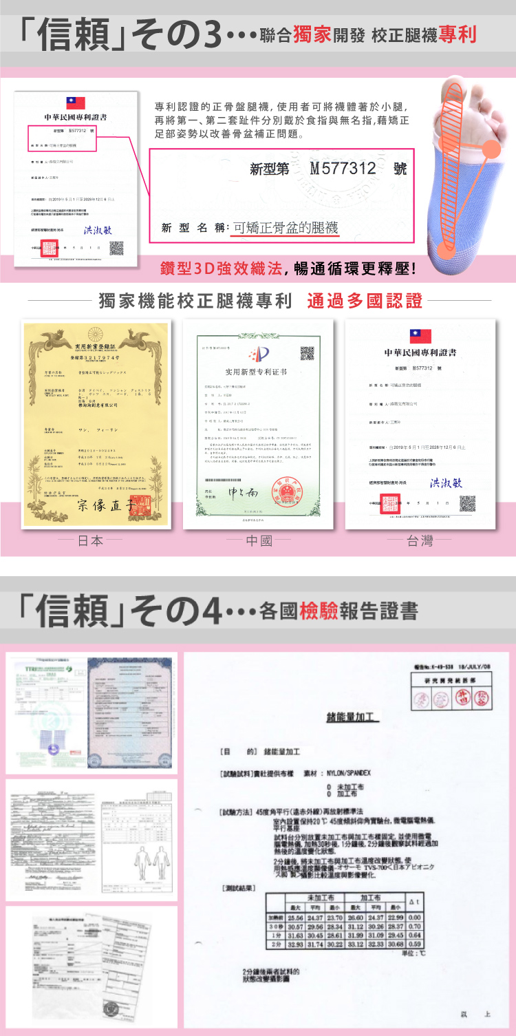 | 產品特色 | 獨家專利立體趾束環能補正重心、紓緩腳足,加速腳尖循環,利用夜寢時間修整姿態,加塑美腿、修臀、抗脹,人體工學設計,能正確分段加壓補正體型, 採用精選彈性紗,舒適親膚透氣無感, 行銷國際,口碑熱銷品。 |