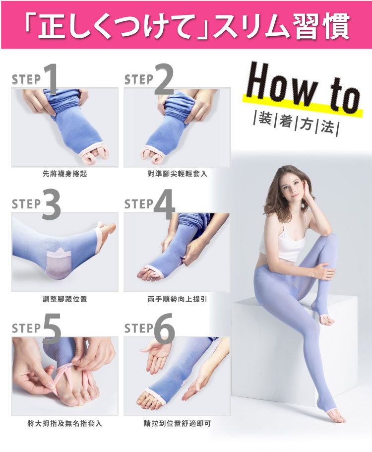 | 使用方式 | 1. 先將襪身捲起,對準腳尖輕輕套入,並調整腳跟位置。 |