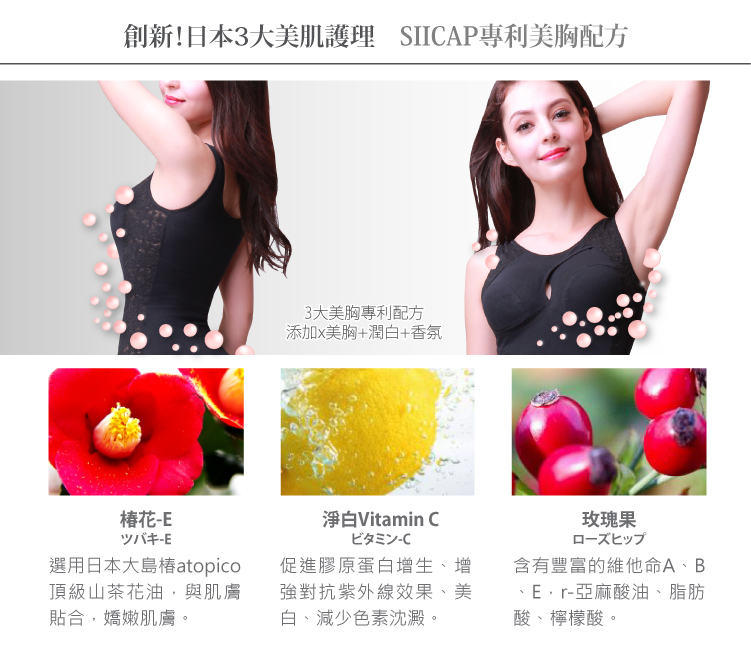 ✔ 美胸專利配方:玫瑰C+椿油E,3週嫩白有感