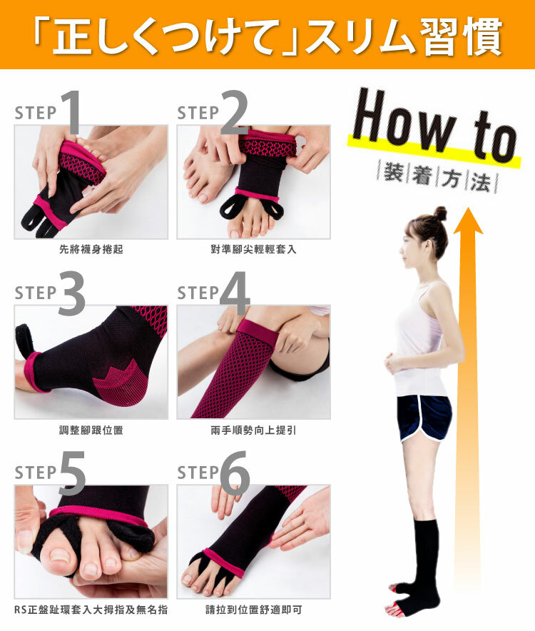 | 產品特色 | 日本專利「RS正盤趾環」補正重心、紓緩腳足,添加日本DamaYaki技術-石墨烯,加速腳尖循環,舒緩腿部感受;特殊鑽型3D編織,採用漸進式加壓,名膜美腿不是夢! |