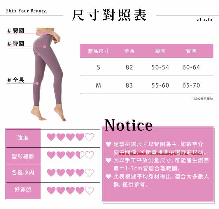 | 產品規格 | 品牌:婭薇恩 aLOVIN 品名:蜜桃高腰收腹瑜珈褲 顏色:星辰黑、丁香紫 成分:75% NYLON、25% POLYURETHANE 尺寸: · S 全長(82cm)、腰圍(50~54cm)、臀圍(60-64cm) · M 全長(83cm)、腰圍(70~80cm)、臀圍(65-70cm) ※ 建議挑選尺寸以臀圍為主,如數字介於中間值,可衡量腰圍挑選舒適尺碼。 ※ 因以手工平放測量尺寸,可能產生誤差值±1-3cm,皆屬合理範圍。 |