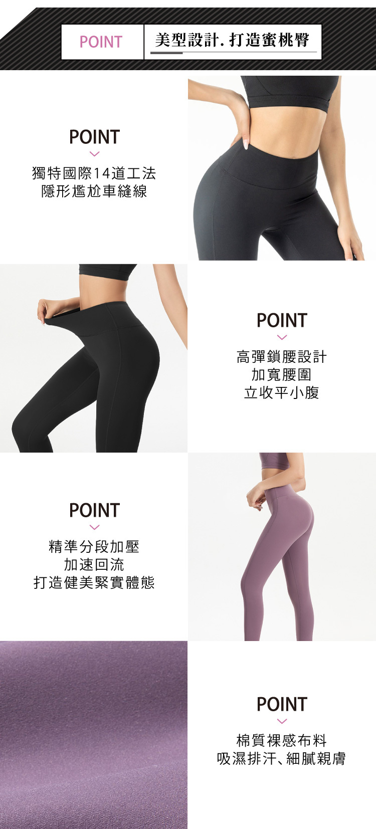 | 產品特色 | 獨特國際14道工法,加強隱形尷尬車縫線,分段加壓收緊贅肉,交叉防護腰頭,好動不磨擦,柔軟曲線貼合,提臀又顯瘦,棉質裸感布料,吸濕排汗、細膩親膚,美型設計一件多用,日常、運動皆可穿。 |