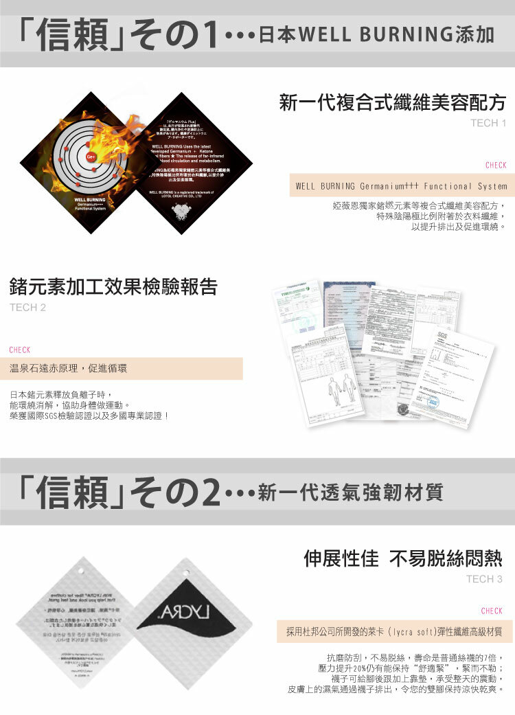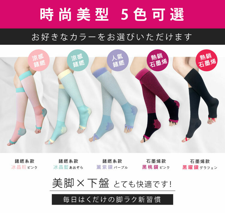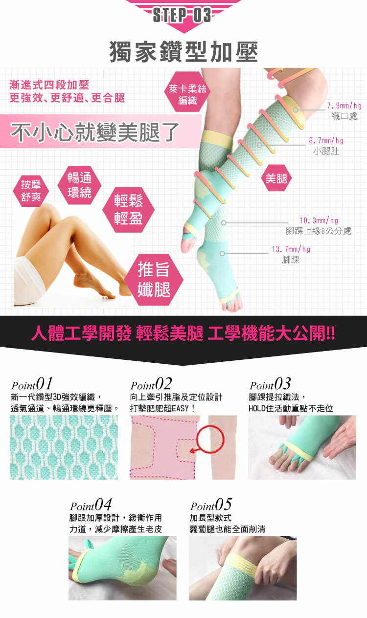 | 產品特色 | 夏日涼感新款上市!特殊涼感紗專利,實驗檢測瞬間降溫1.2℃,夏日必備美腿神器!添加日本遠赤G+鍺元素,提升代謝排廢、加速消卡,睡醒美腿更輕盈,獨家RS專利趾環,改善無意識浮趾,穩定重心、補正下盤,幫助調整體態,越穿腿越美,特殊鑽型3D加壓編織,採用4段漸進式加壓,舒緩腿部整日疲勞,美腿更暢通,名模美腿不是夢。 |