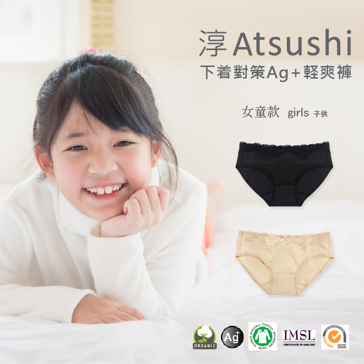 品牌:淳 Atsushi 品名:下着對策Ag+軽爽褲(女童款) 顏色:純淨黑 尺寸:S:46-53cm、M:51-58cm、L:56-64cm 成分:5% Organic cotton(有機棉) + 5% Spandex (彈性纖維) |